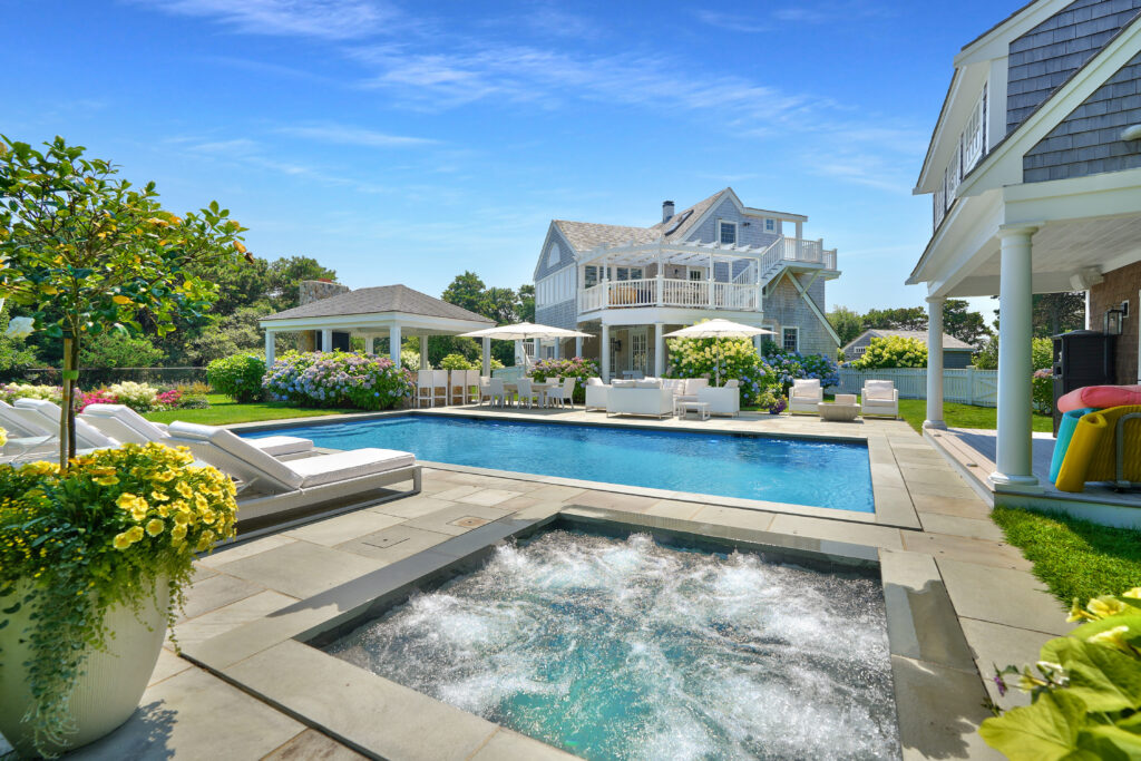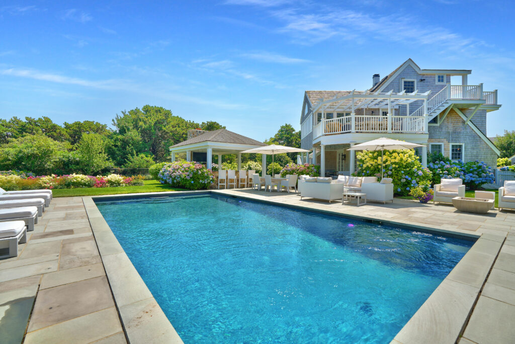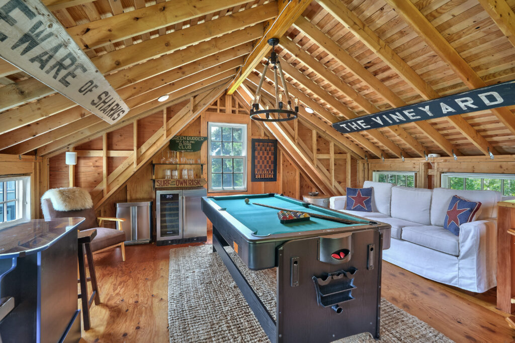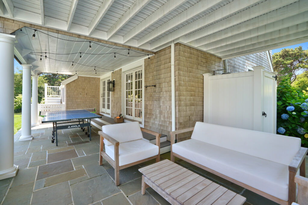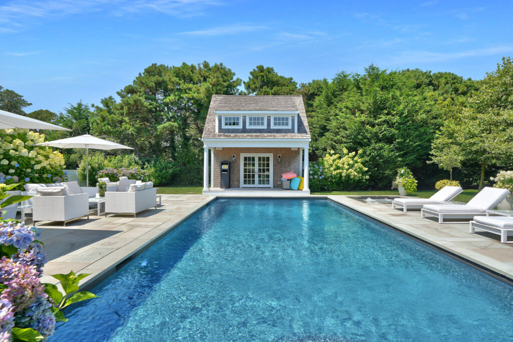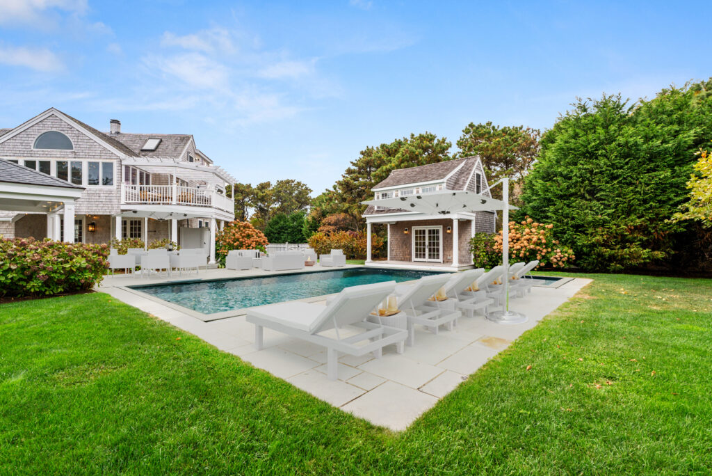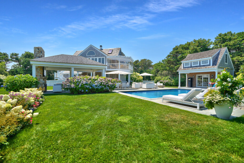 Experience the ultimate outdoor oasis at our Martha’s Vineyard luxury home rental. The inviting Gunite saltwater pool, complete with a hot tub, is surrounded by meticulously landscaped grounds adorned with vibrant hydrangea bushes. Enjoy evenings by the fire pit on the stone patio or challenge friends to a game of ping pong or bocce. The brand new two-story pool house features a game room with a pool table, air hockey, and comfortable seating, along with a half bath for convenience. On the opposite side of the pool, the outdoor entertainment area awaits with a large grill, sink, refrigerator, wine fridge, and a pizza oven, all complemented by a SunBrite outdoor TV for the perfect alfresco gatherings.