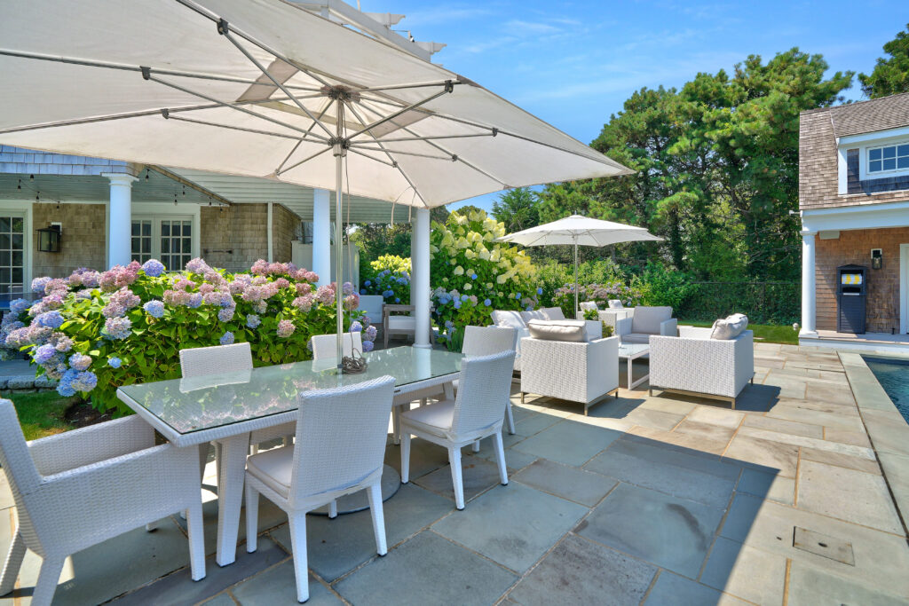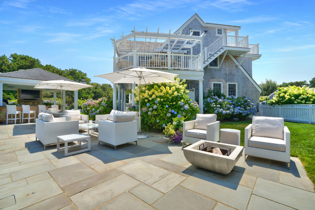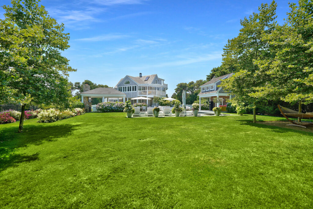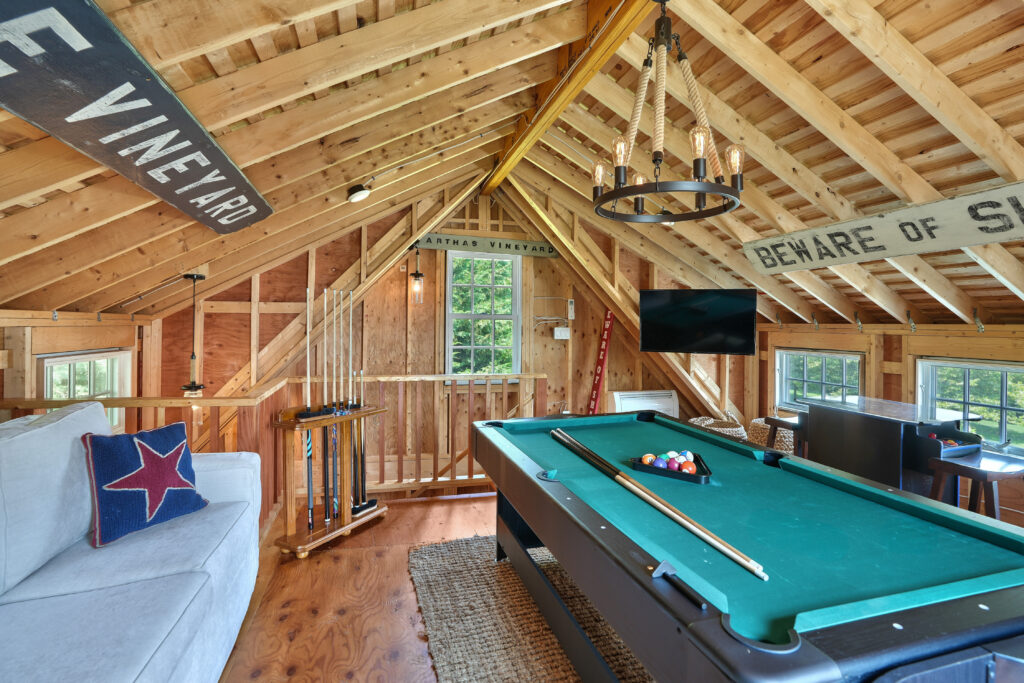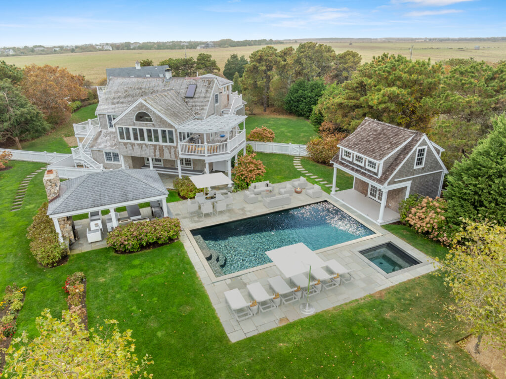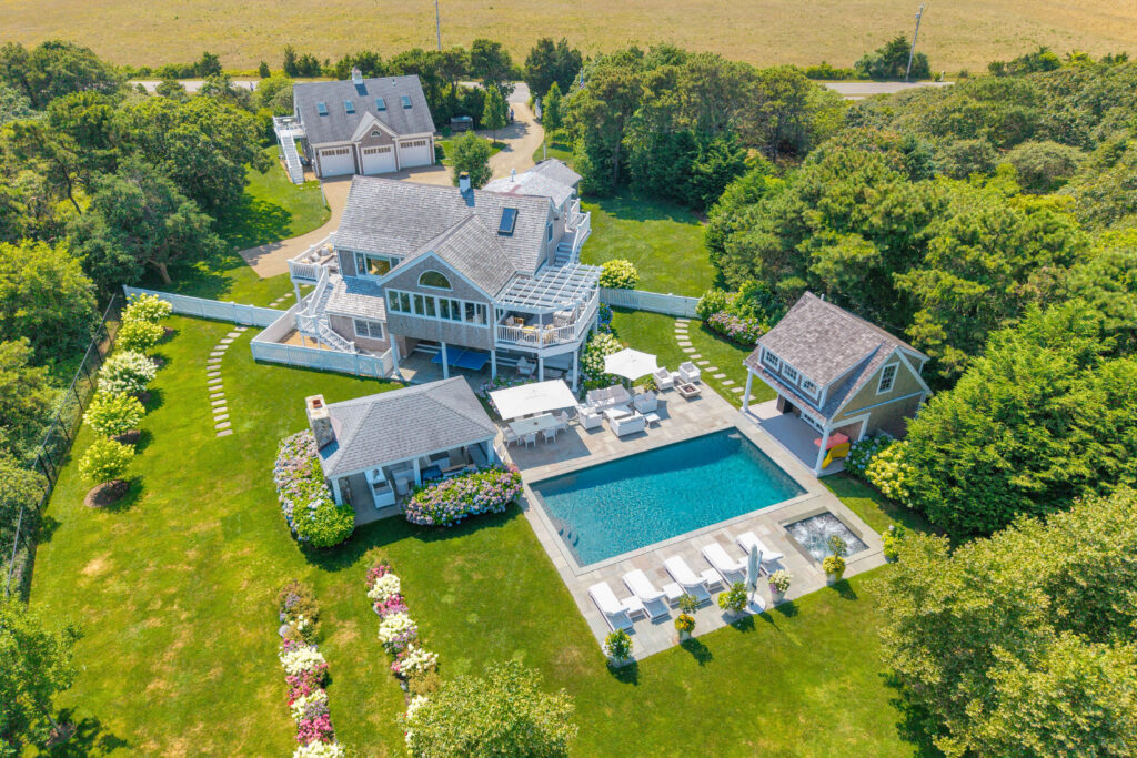 Experience the ultimate outdoor oasis at our Martha’s Vineyard luxury home rental. The inviting Gunite saltwater pool, complete with a hot tub, is surrounded by meticulously landscaped grounds adorned with vibrant hydrangea bushes. Enjoy evenings by the fire pit on the stone patio or challenge friends to a game of ping pong or bocce. The brand new two-story pool house features a game room with a pool table, air hockey, and comfortable seating, along with a half bath for convenience. On the opposite side of the pool, the outdoor entertainment area awaits with a large grill, sink, refrigerator, wine fridge, and a pizza oven, all complemented by a SunBrite outdoor TV for the perfect alfresco gatherings.