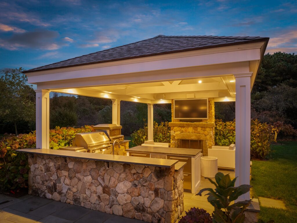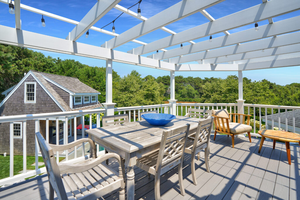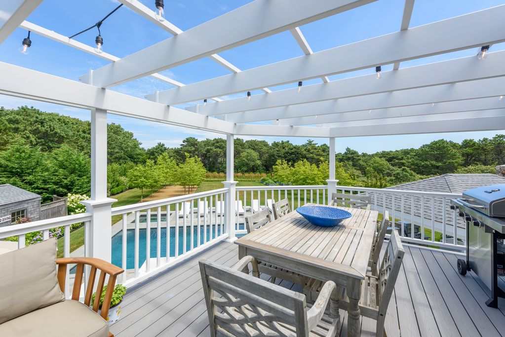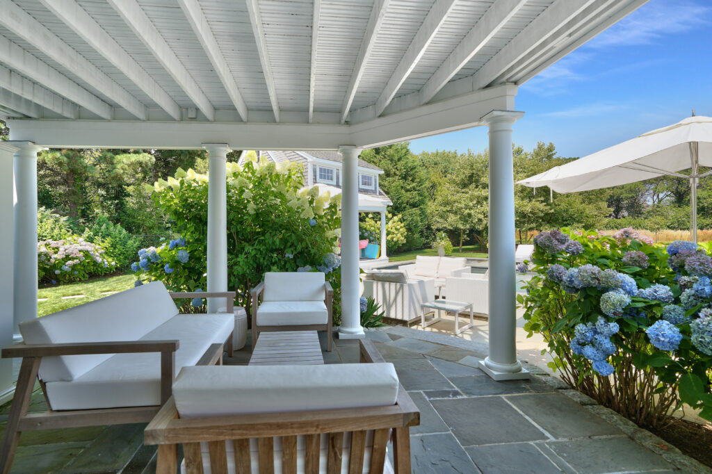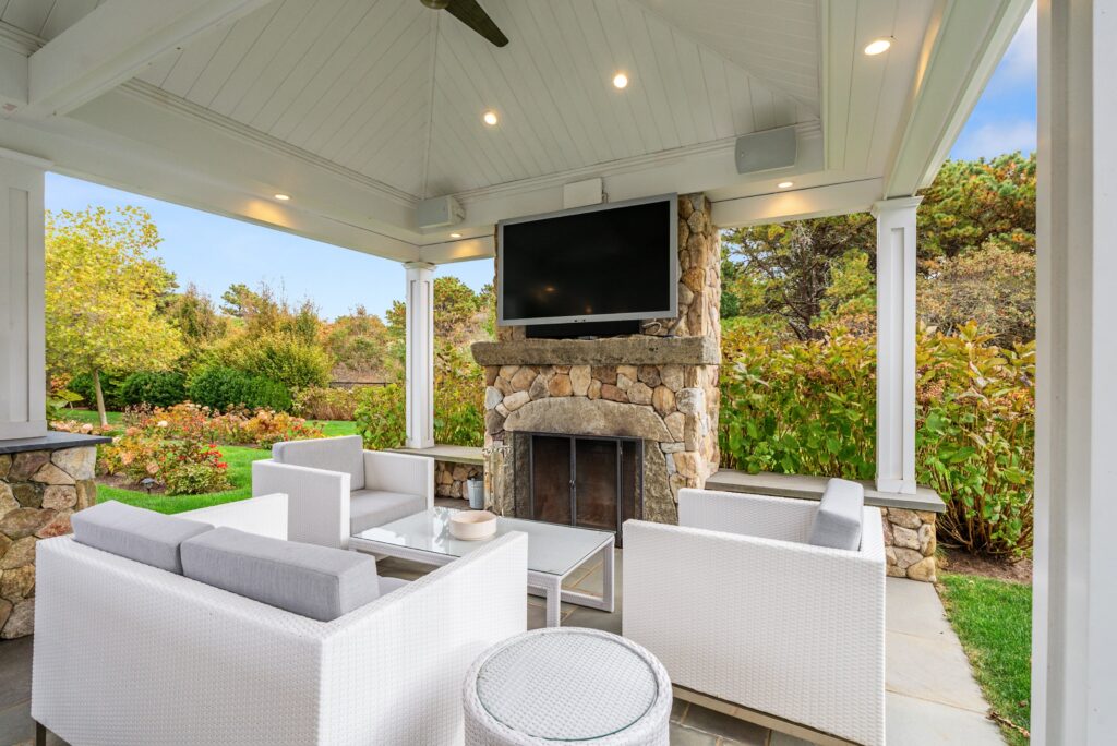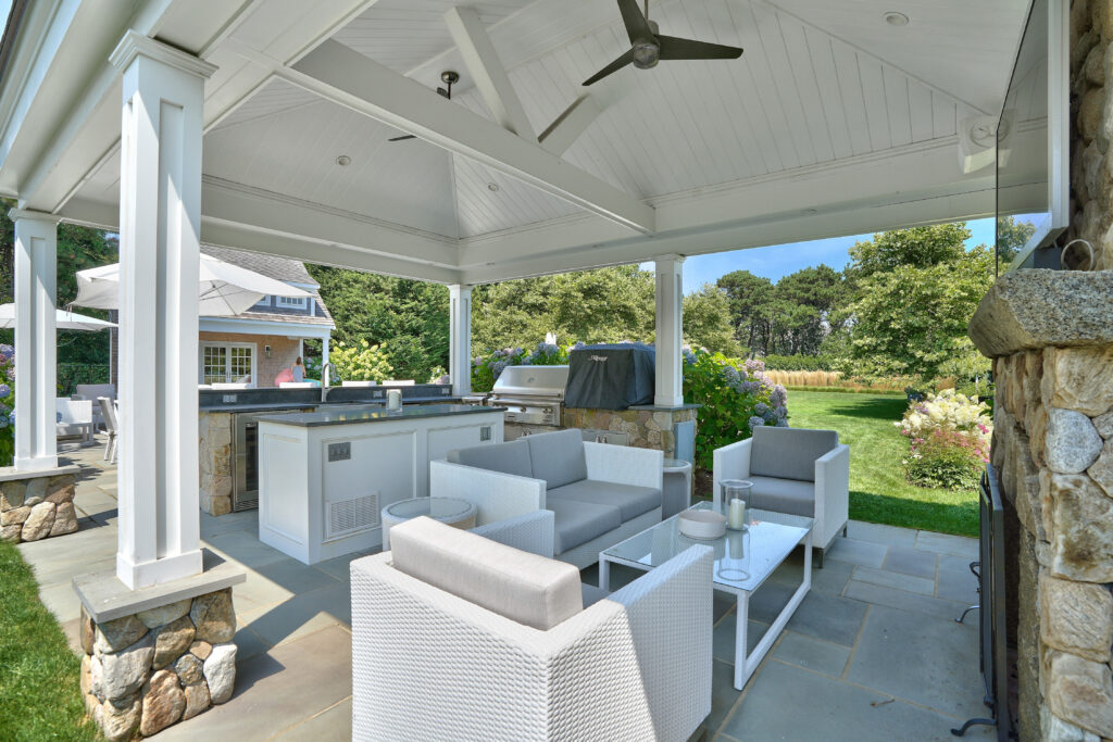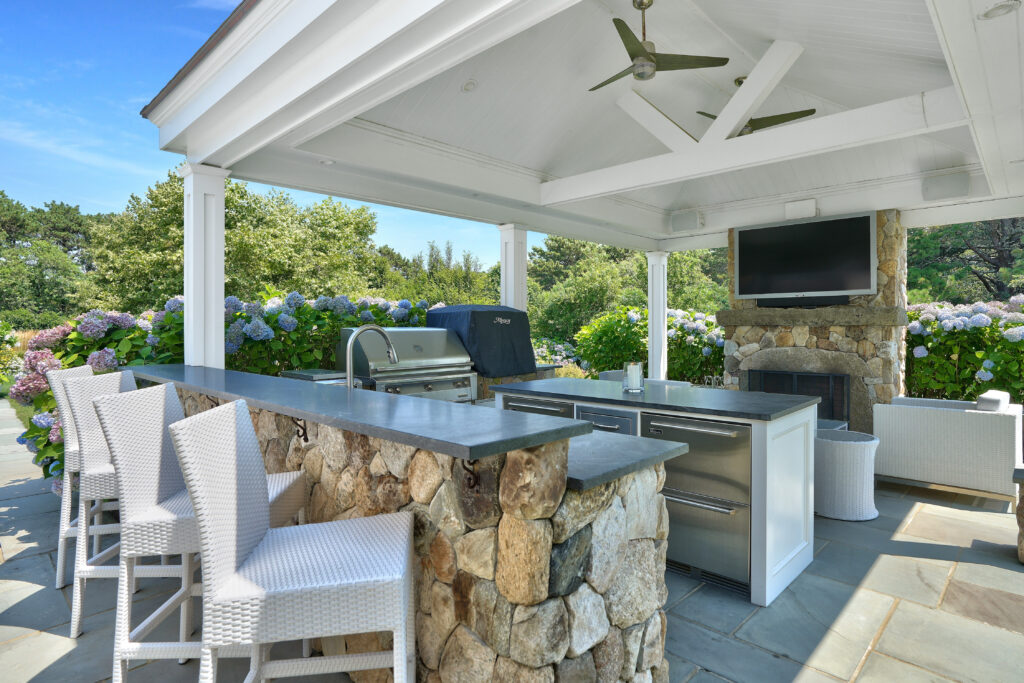 Experience the ultimate outdoor oasis at our Martha’s Vineyard luxury home rental. The inviting Gunite saltwater pool, complete with a hot tub, is surrounded by meticulously landscaped grounds adorned with vibrant hydrangea bushes. Enjoy evenings by the fire pit on the stone patio or challenge friends to a game of ping pong or bocce. The brand new two-story pool house features a game room with a pool table, air hockey, and comfortable seating, along with a half bath for convenience. On the opposite side of the pool, the outdoor entertainment area awaits with a large grill, sink, refrigerator, wine fridge, and a pizza oven, all complemented by a SunBrite outdoor TV for the perfect alfresco gatherings.