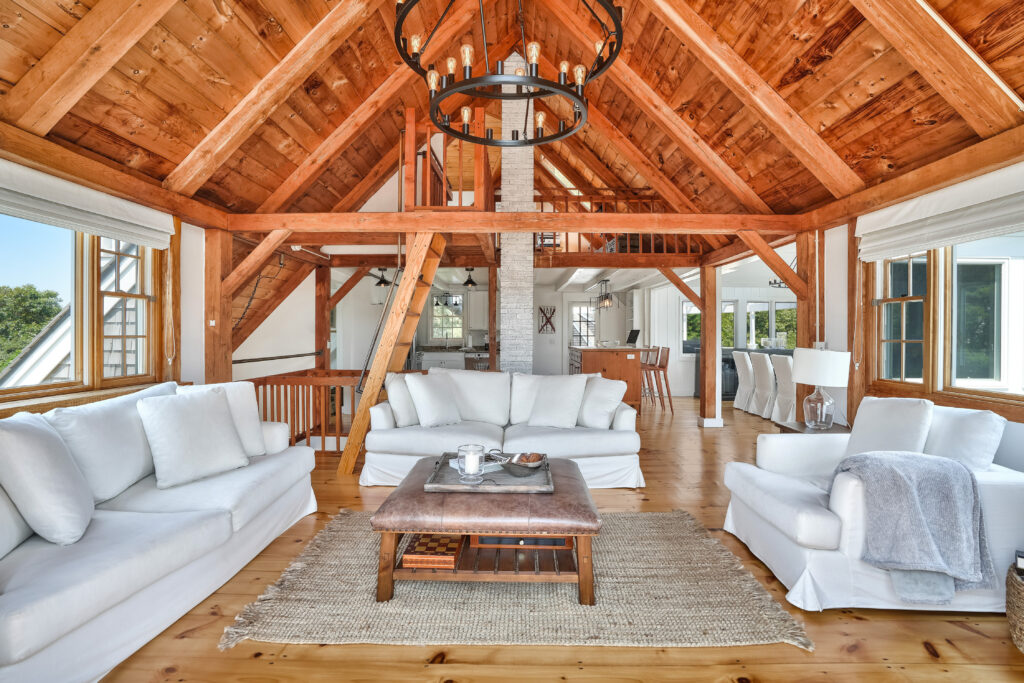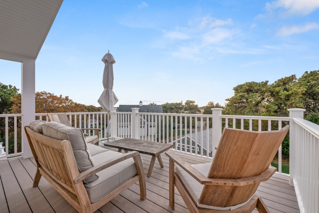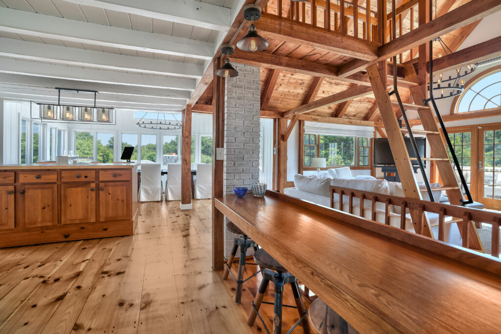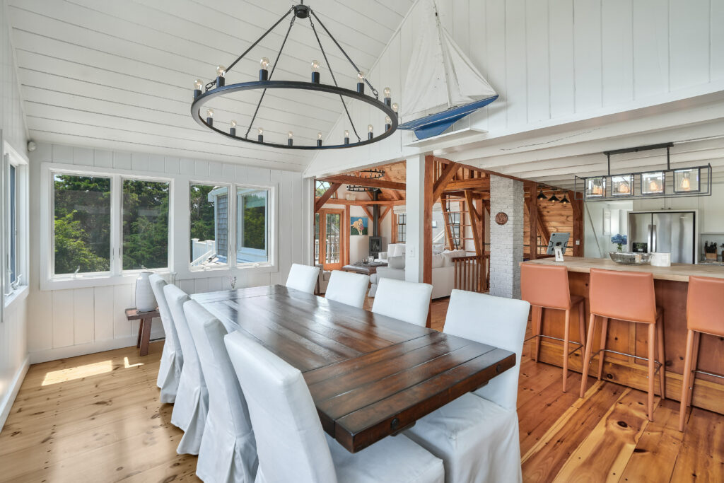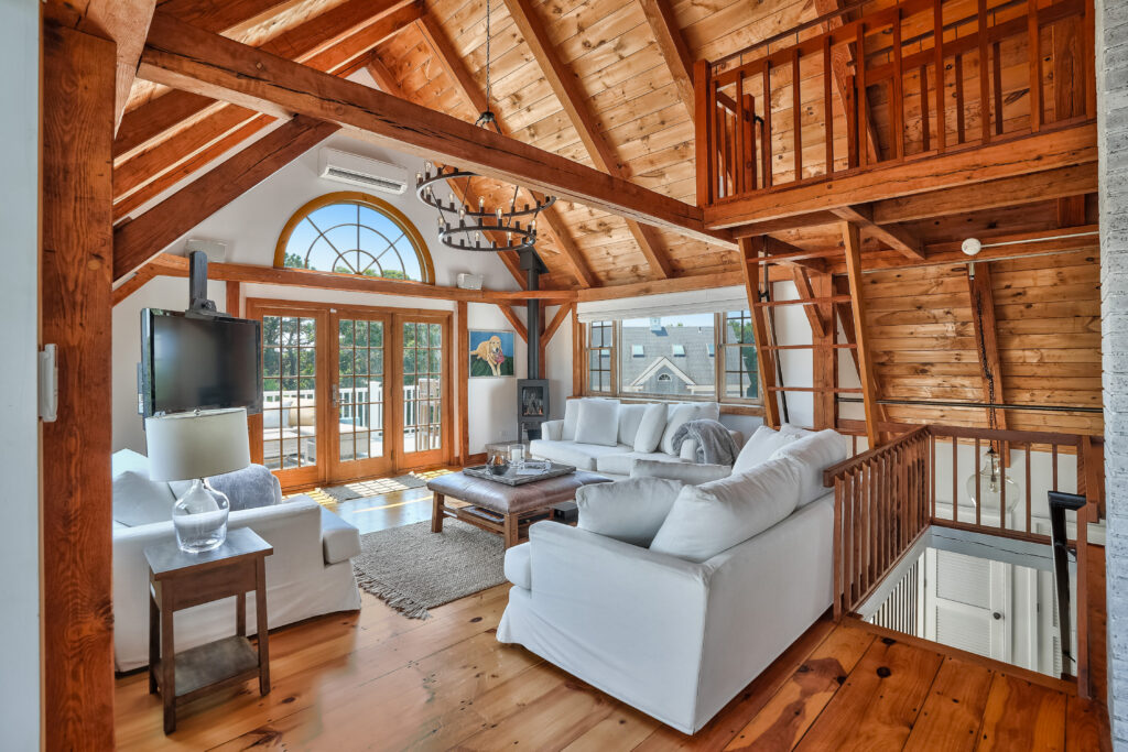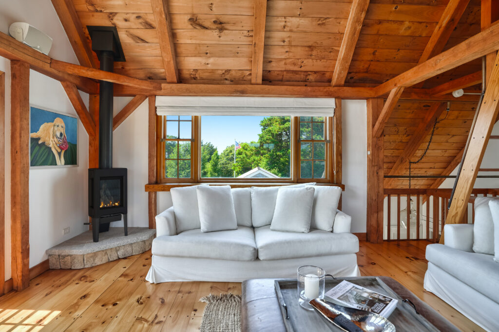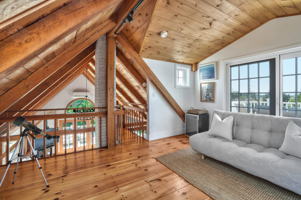 The expansive second-floor kitchen, living, and dining area boasts an open-concept design, bathed in natural light and offering breathtaking views of the surrounding conservation land. The stylishly furnished loft office features a private deck, complete with a cozy lounge area and a high-top bar table that comfortably seats five, perfect for enjoying morning coffee or sunset cocktails. This seamless blend of indoor elegance and outdoor tranquility creates an ideal setting for relaxation and entertainment at your Martha's Vineyard beach house.