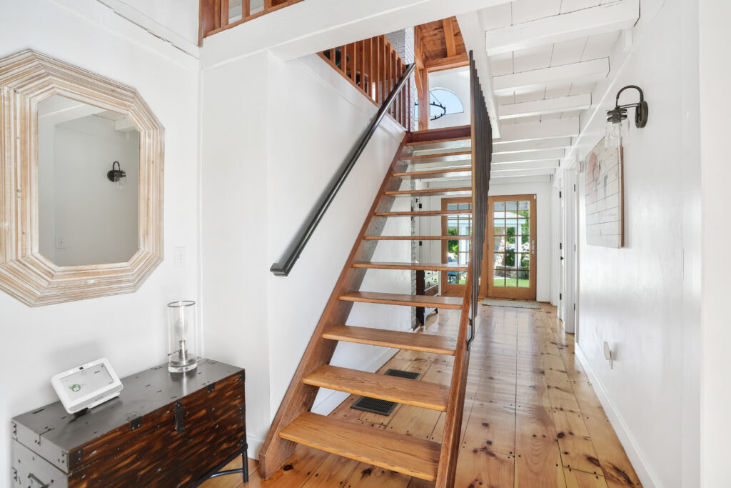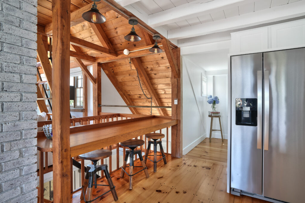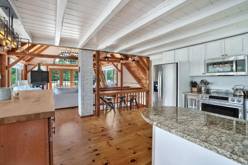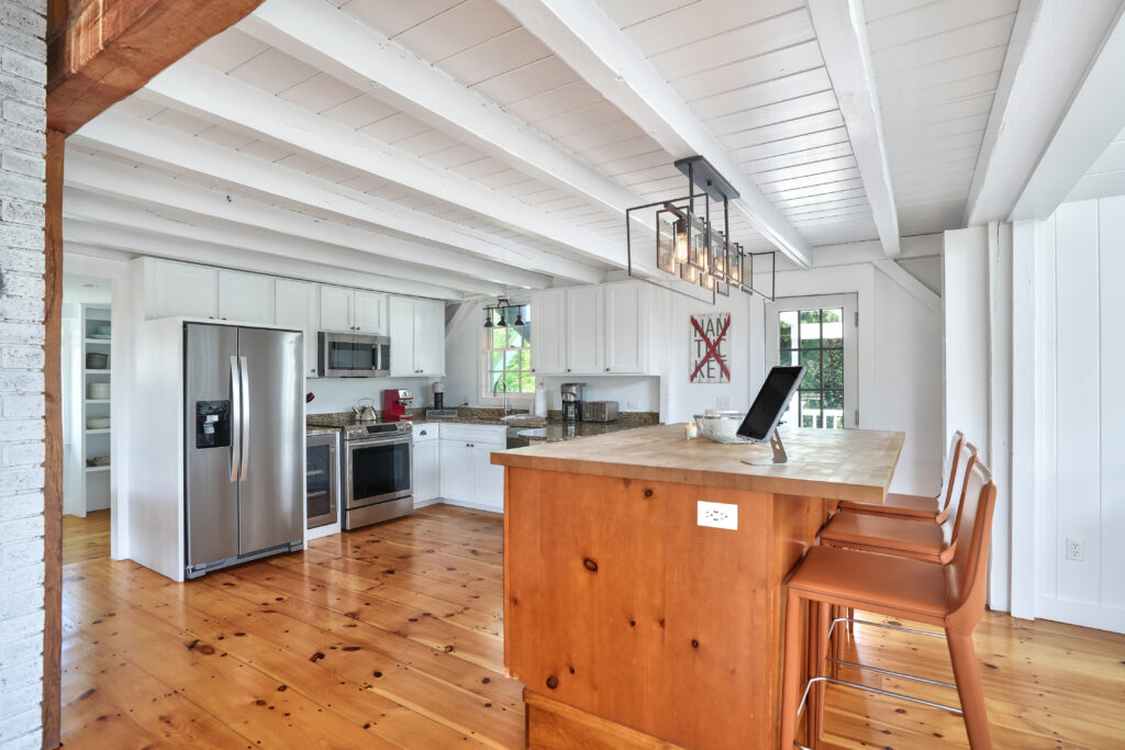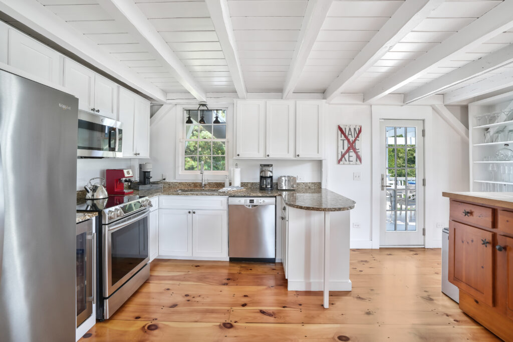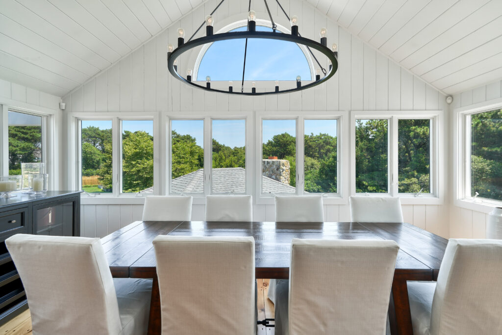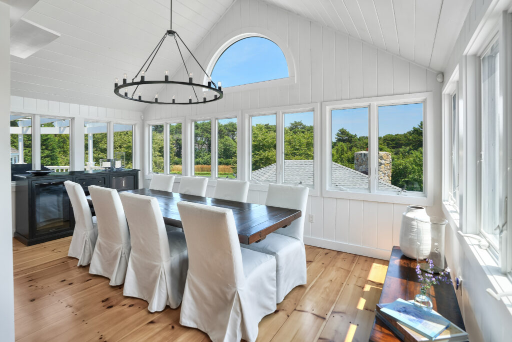 The expansive second-floor kitchen, living, and dining area boasts an open-concept design, bathed in natural light and offering breathtaking views of the surrounding conservation land. The stylishly furnished loft office features a private deck, complete with a cozy lounge area and a high-top bar table that comfortably seats five, perfect for enjoying morning coffee or sunset cocktails. This seamless blend of indoor elegance and outdoor tranquility creates an ideal setting for relaxation and entertainment at your Martha's Vineyard beach house.